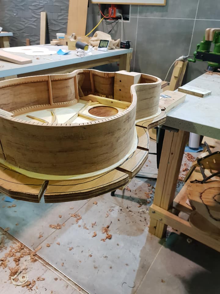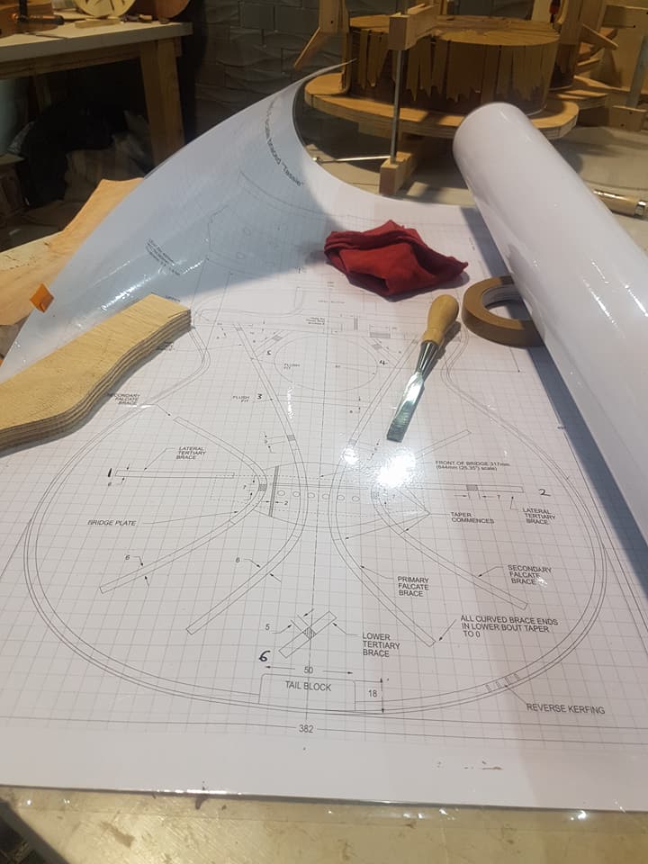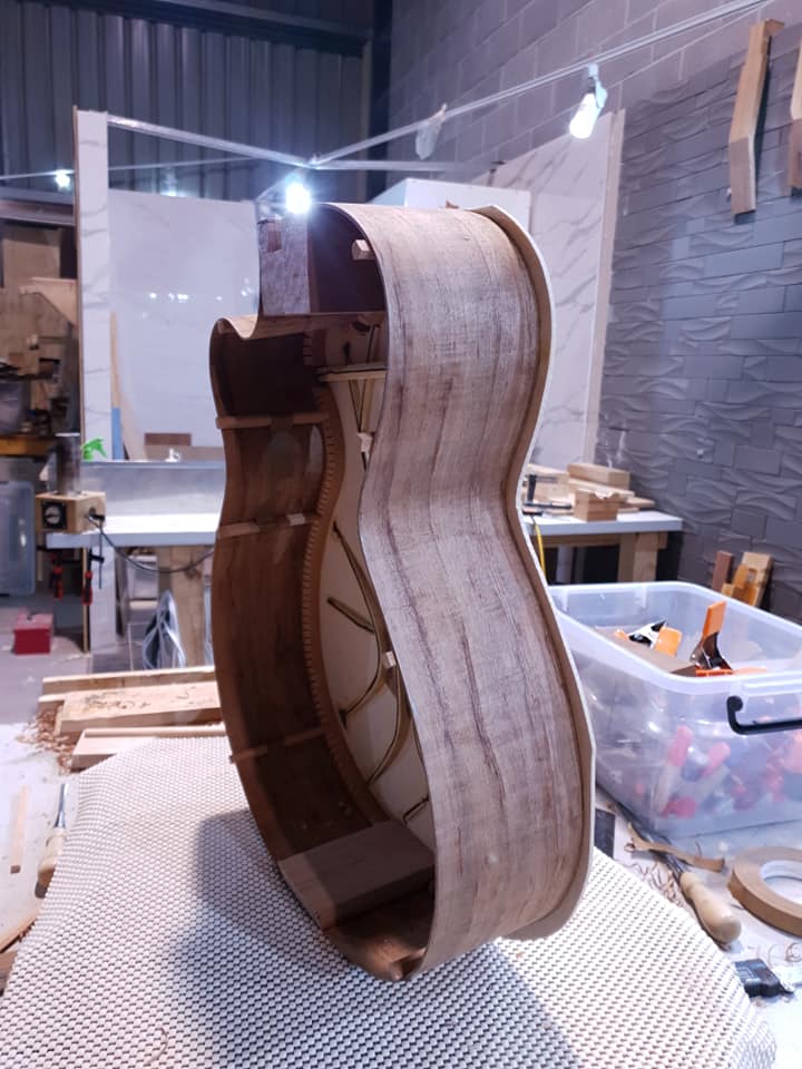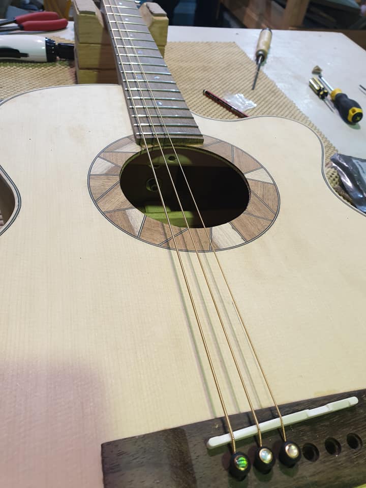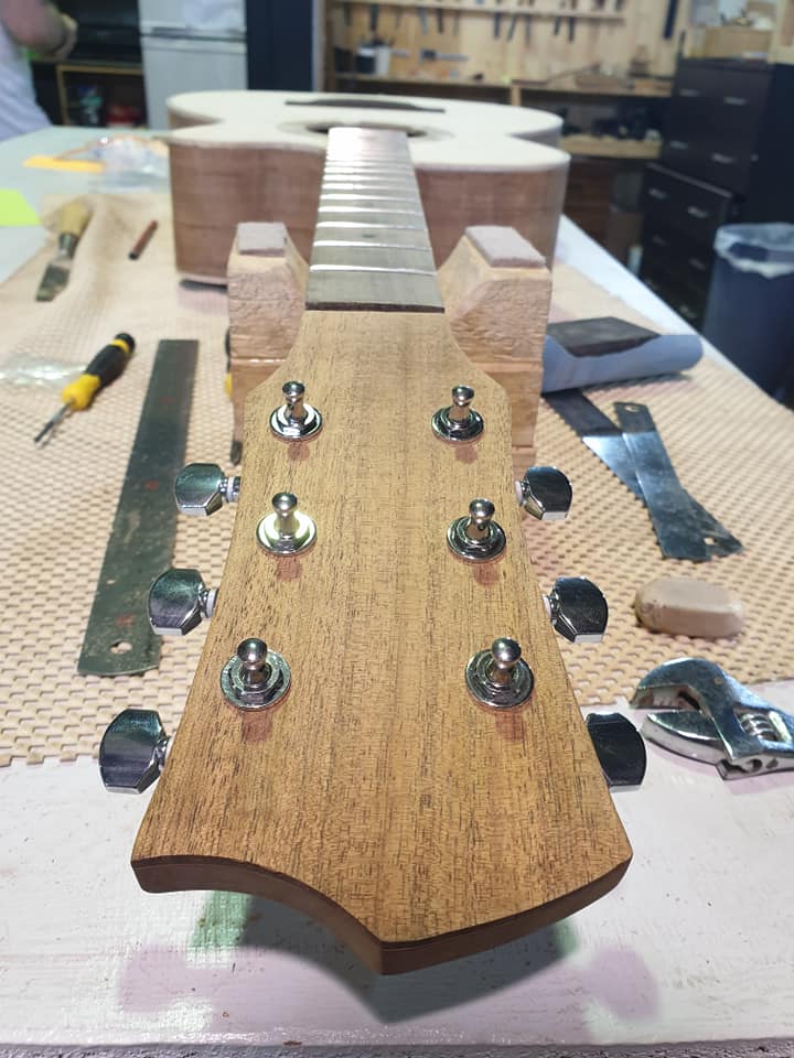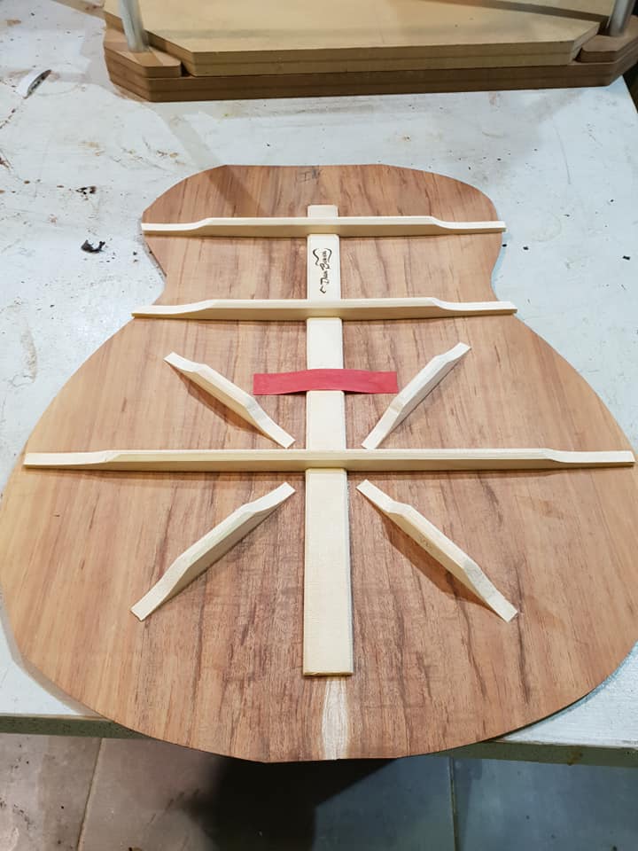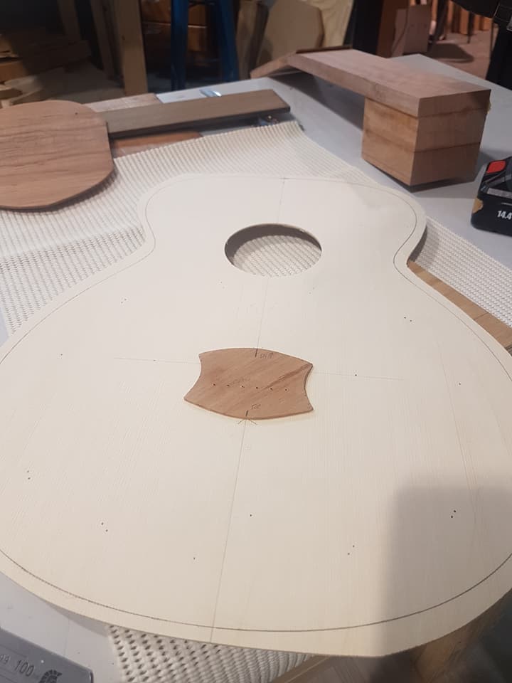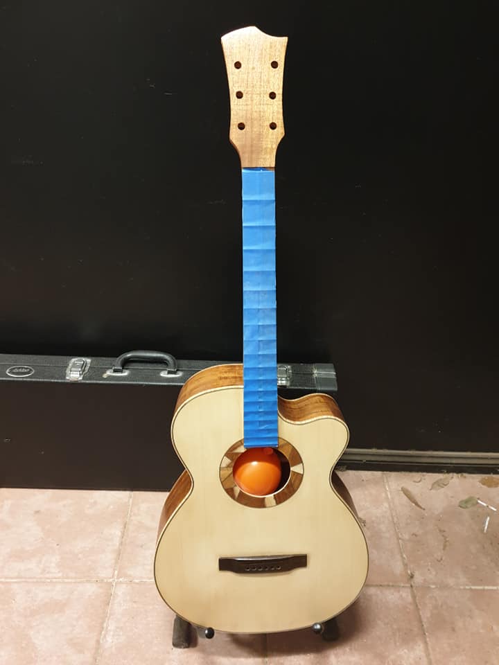 This is an OM (Orchestral Model) with Toscano Bracing and design. Queensland Walnut fignerboard and Tasmanian Blackwood with Engleman Spruce sound board.